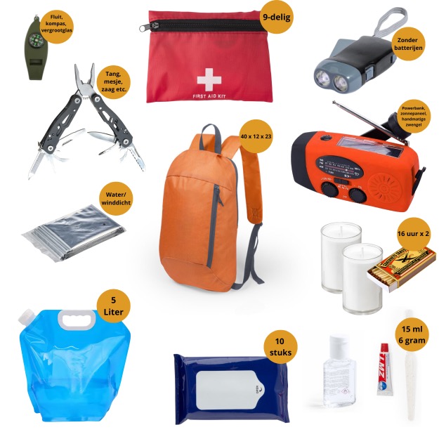 Een goed samengesteld noodpakket helpt je om de eerste 72 uur na een ramp of noodsituatie zelfstandig door te komen. Volgens de aanbevelingen van de overheid via de website “Denk Vooruit” zou een basis noodpakket de volgende items moeten bevatten: