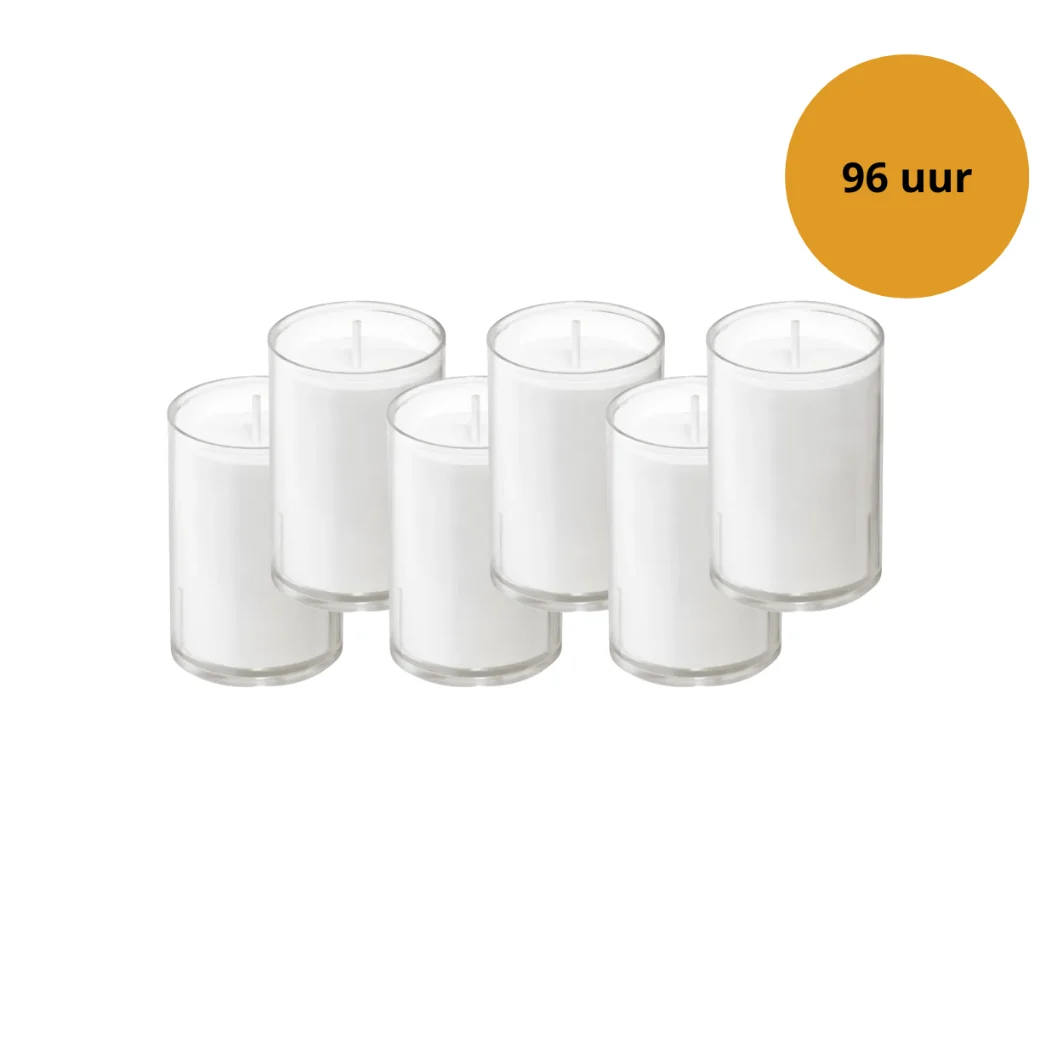 - Kaarsen: 6 x 16 lichturen (96 uur in totaal)
