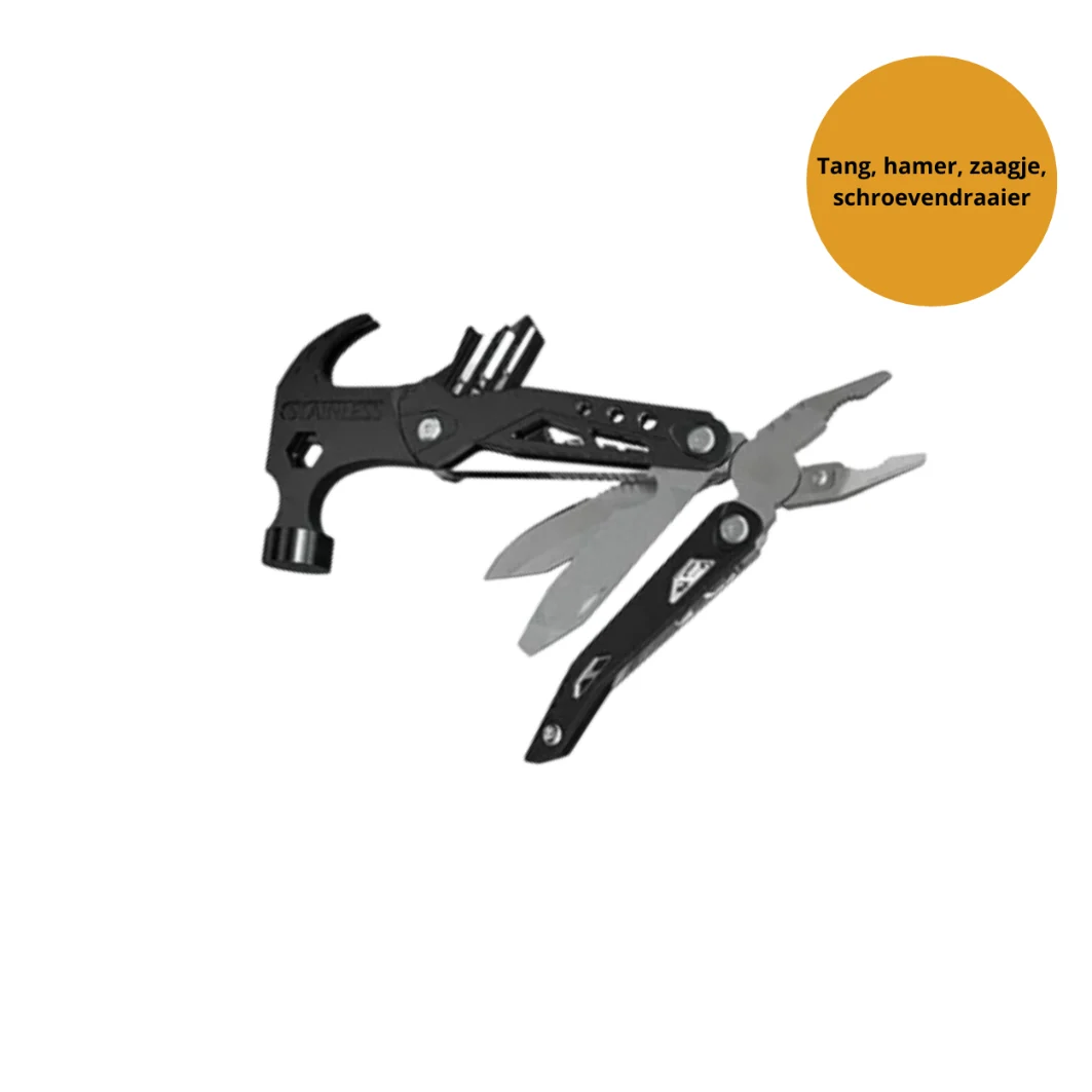 - Multitool hoge kwaliteit: tang, hamer, mesjes, zaagje, schroevendraaier + extra bitjes en opener.