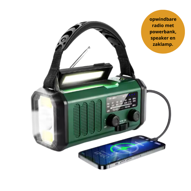 - Noodradio hoge kwaliteit: opwindbare radio met powerbank, zonnepaneel en zaklamp.