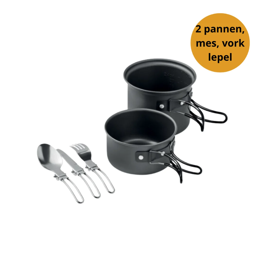 - Kookset: 2 pannen van licht gewicht en mes, vork en lepel.
